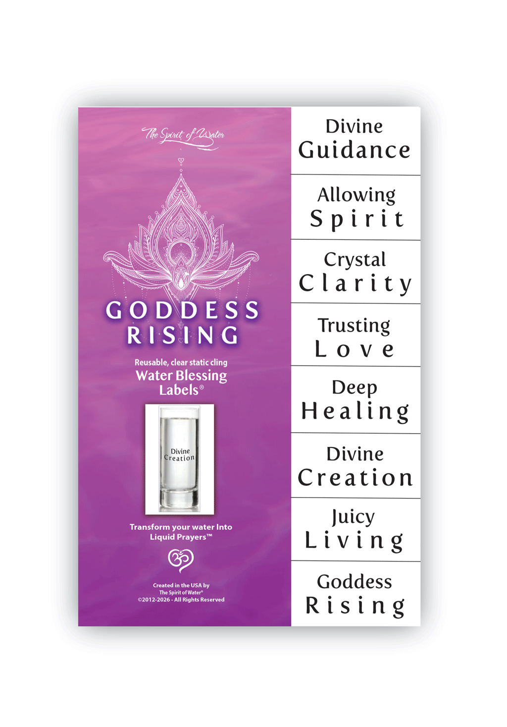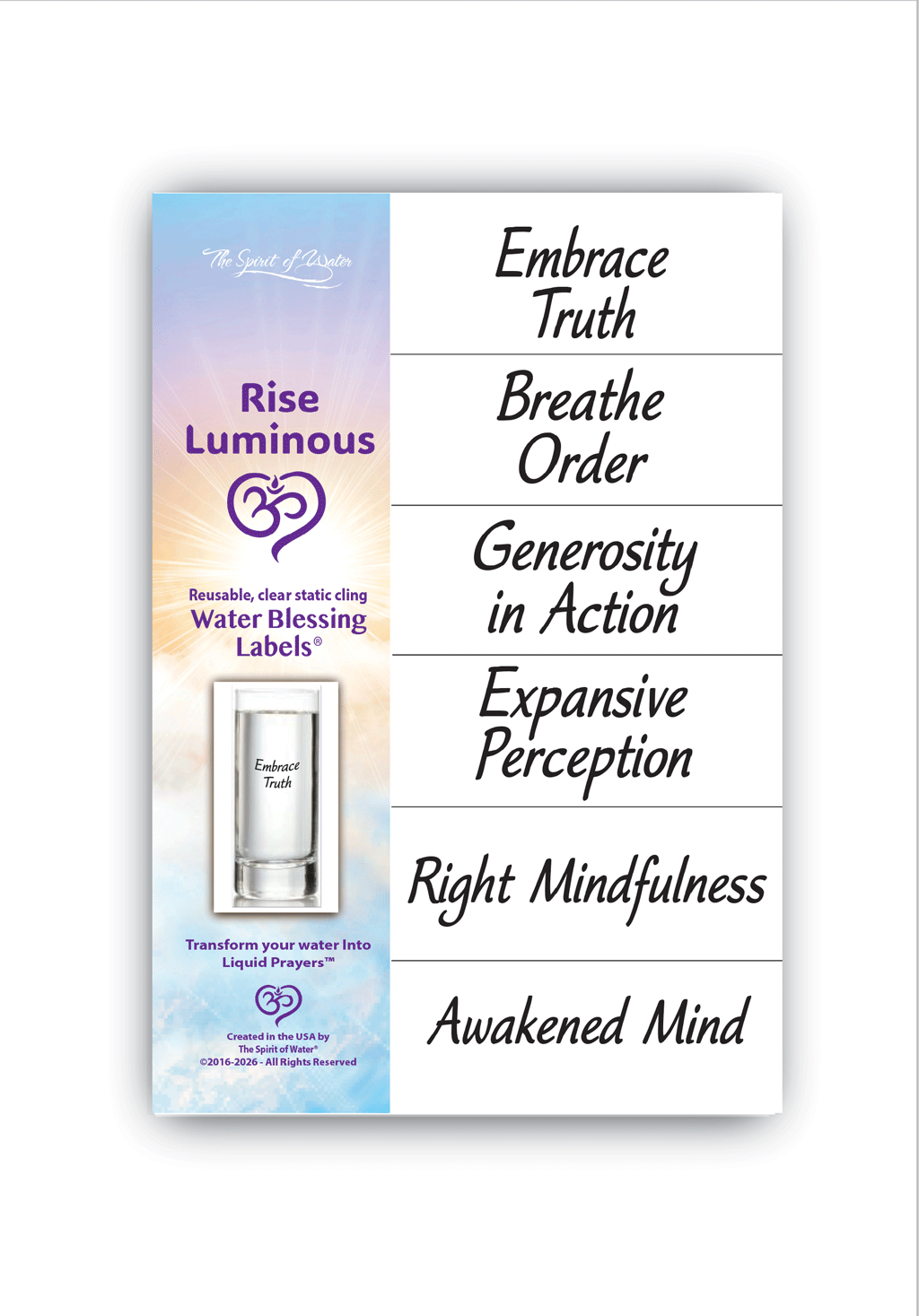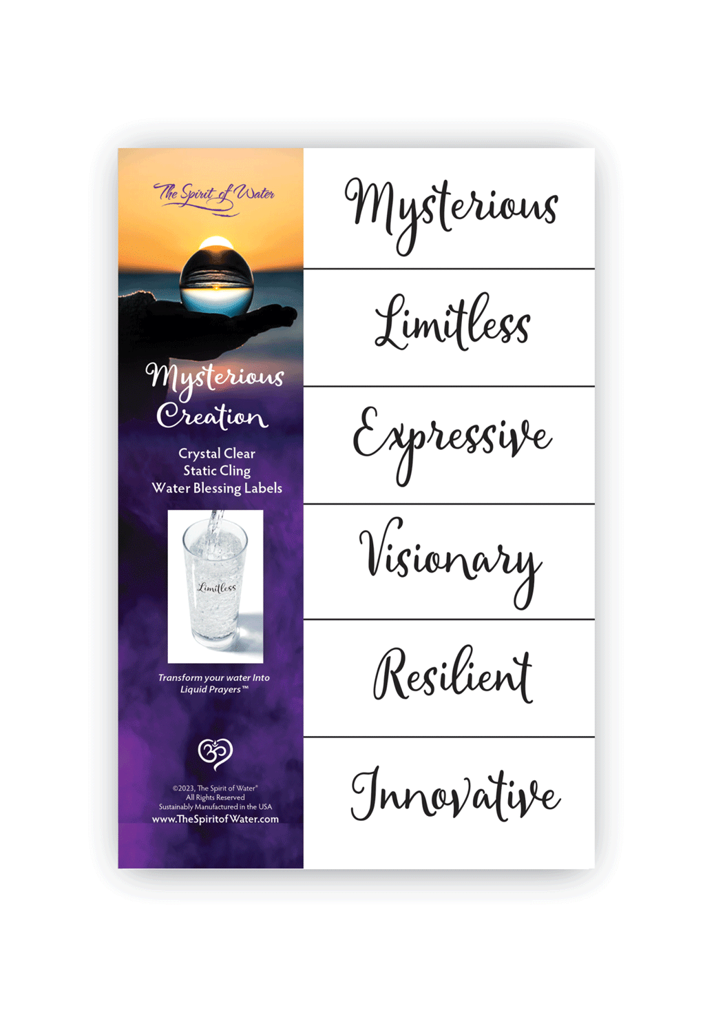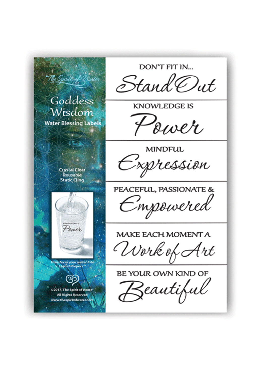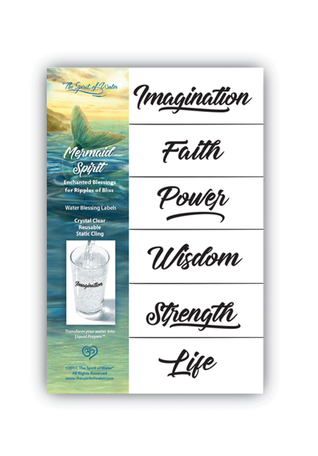 Order a selection of these blessings for best pricing.  There are 6 blessing labels in most mini package but some have 8. Great for gifts, events, prize incentives, classes, etc. This entire collection weighs 1 lb. and requires a box to accommodate the weight and thickness; and therefore a minimal shipping cost will be charged at checkout. If you want multiples of individual items, contact me at reply@thespiritofwater.com and I will make arrangements for your special assortment at this greatly reduced price.