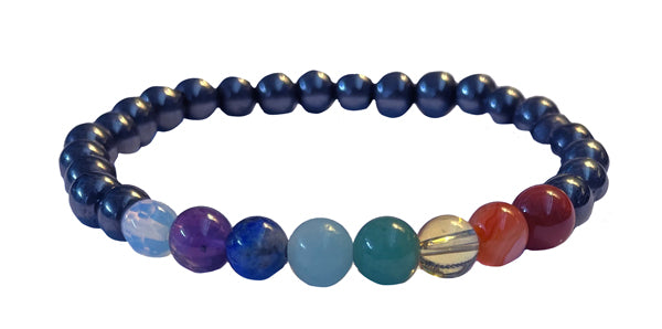 This Stretch Bracelet is made with Hematite and natural Chakra Gemstone beads. It features the qualities of the eight lower Chakras, not just the traditional seven. This bracelet is a powerhouse of radiant magnetic energies and the pure natural energies of real gemstones.