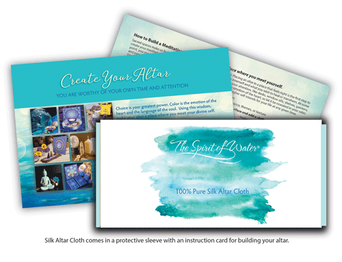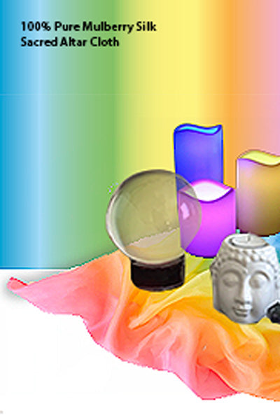These scarves are elegant, gorgeous, and represent water in a tactile sense as you allow the fabric to flow over your surface. The rainbow colors are rich and non-fade. This cloth is woven of 100% pure Mulberry Silk, using ecological kindness and sustainable methods. It is dyed with non-toxic pigments often derived from organic plant matter. The vibe you add to your altar is elevated by using a surface that reflects the true beauty of nature as it receives the rainbow colors from the sun. Build your altar from the ground up. 21" x 21" is a perfect size for table top flat or draping arrangements. Float your scarf on the surface and let the waves and wrinkles become part of the beauty of your sacred space.