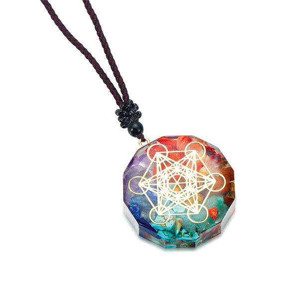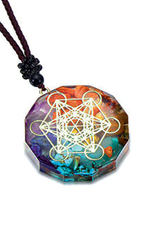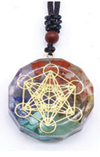 As a healer, his energy lends to chakra balance and best health. The stones embedded in the resin form are natural gemstones from the earth and work together to set up a healing field. This Pendant carries the golden symbol of Metatron's Cube, a symbol that contains all the geometric shapes in Creation and those shapes make up all parts of life from atom to manifest reality. This further reminds the body of its perfect harmony.