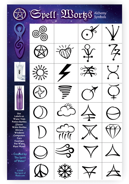 These 32 static cling symbols bring specific energies to your potions and blends. Use them for casting spells or blessings. The properties of each element adds an energy boost to your intentions and modifies the power of your blend. This label set includes alchemy symbols from the period table and some symbols of ancient origin that are used in spell works and witchcraft. There are also weather symbols and moon phase symbols all of which have profound influence on serious spell work.