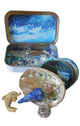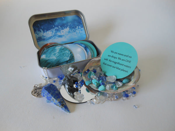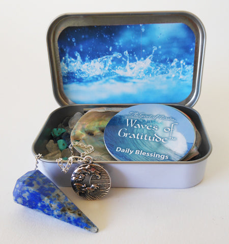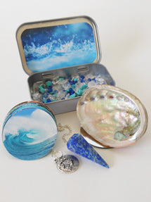 A perfect gift for practitioners of Gratitude and Ocean Love. Let these tiny cards help you set an daily intention. The cards show beautiful photos of the ocean. This Tiny Altar contains a 12-card deck, a Lapis Pendulum with Mystic Wave Charm to help choose your card if you wish, a reflecting mirror, a small abalone shell to use for your offerings, and a gravel bed of turquoise, clear quartz crystals, and Lapis. These semi-precious stones vibrate to the higher resonance of gratitude, a feeling that is life-affirming and transformative.