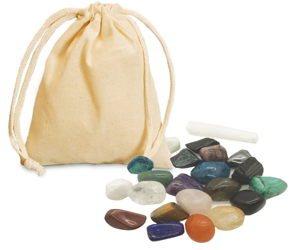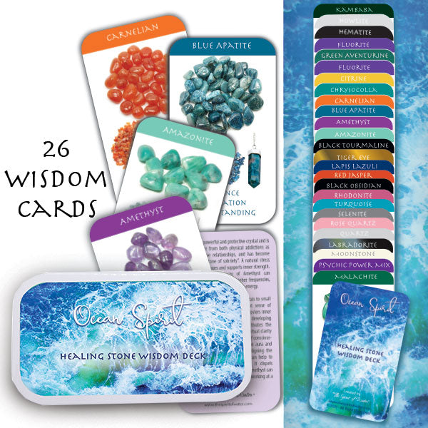 Ocean Spirit Healing Stone Wisdom Deck is a handy pocket altar in a metal tin. Crystals and stones are more popular than ever now, and when used for healing and divination, their power is undeniable. Use these cards to learn the properties of the main stones used in all spiritual healing practices. This 26-piece Card Deck helps to keep your wisdom all in one place. The metal tin is easy to stash and carry anywhere. Use your cards to make spreads or oracles. A pendulum is a perfect way to dowse your answers when choosing a stone to work with. The energy of each stone comes through in the full color photography, the words, and your strong intentions. To be more effective, add a pouch of the 26 stones representing each one in this wisdom deck. Stones are ½"-¾" and perfect for Reiki and grid boards, too. Purchase the stone pouch alone, too.