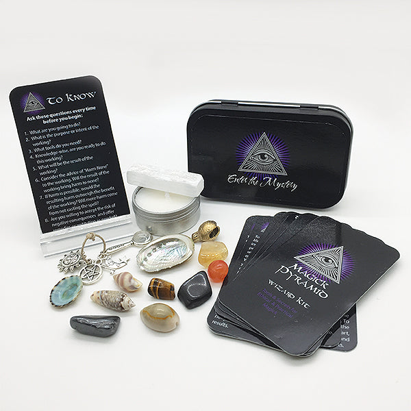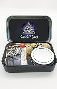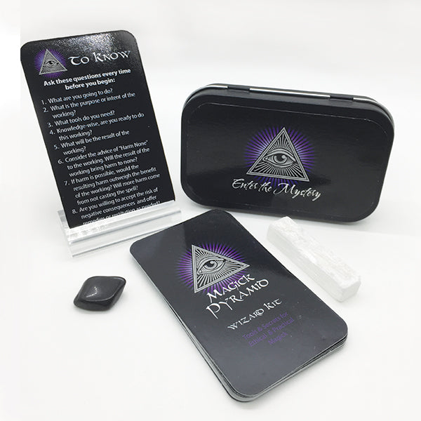 Practitioners of the witchy arts follow a traditional secret pyramid of self-inquiry before casting spells or doing any magic workings. This kit comes in a tin 3.75” x 2.25” and fits easily into a pocket or purse. Create an altar wherever you go. You will have everything you need to set up your ceremony or ritual before you begin your spell work. Your kit includes: