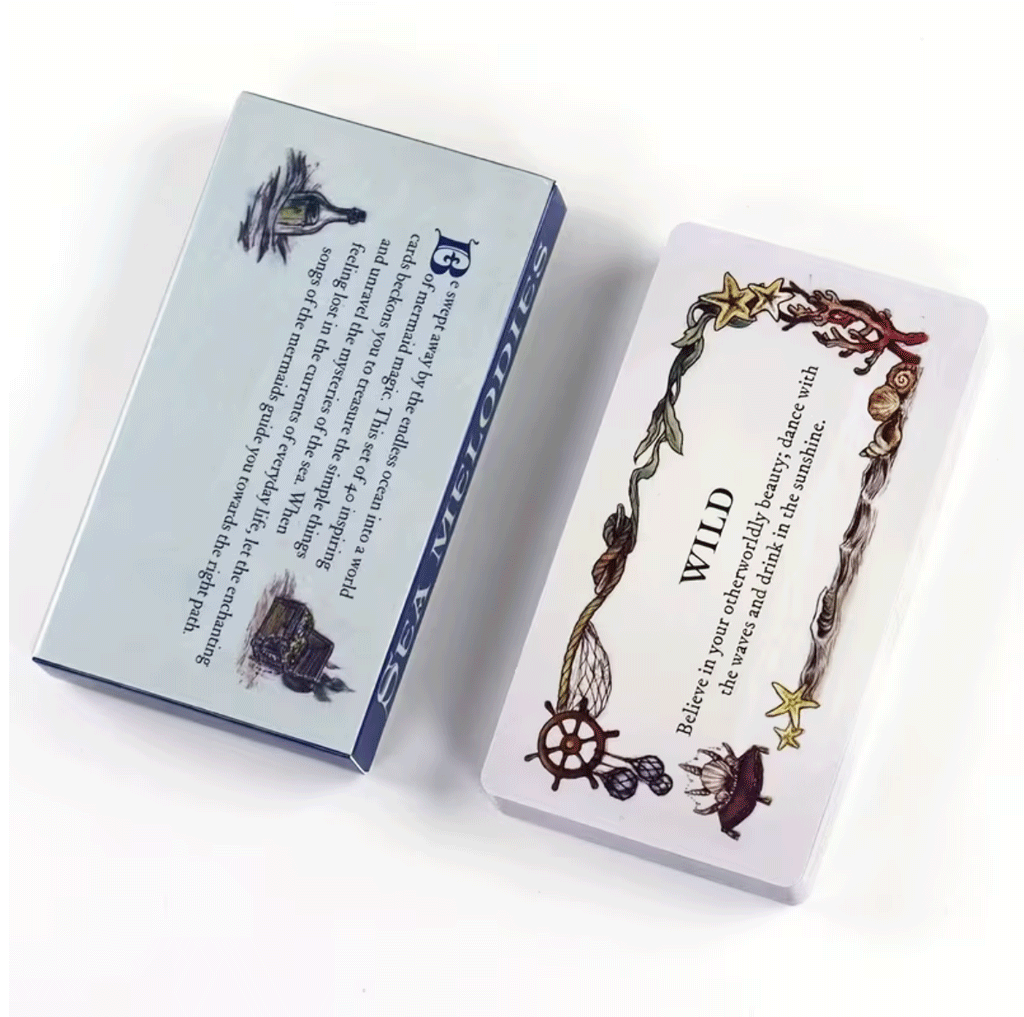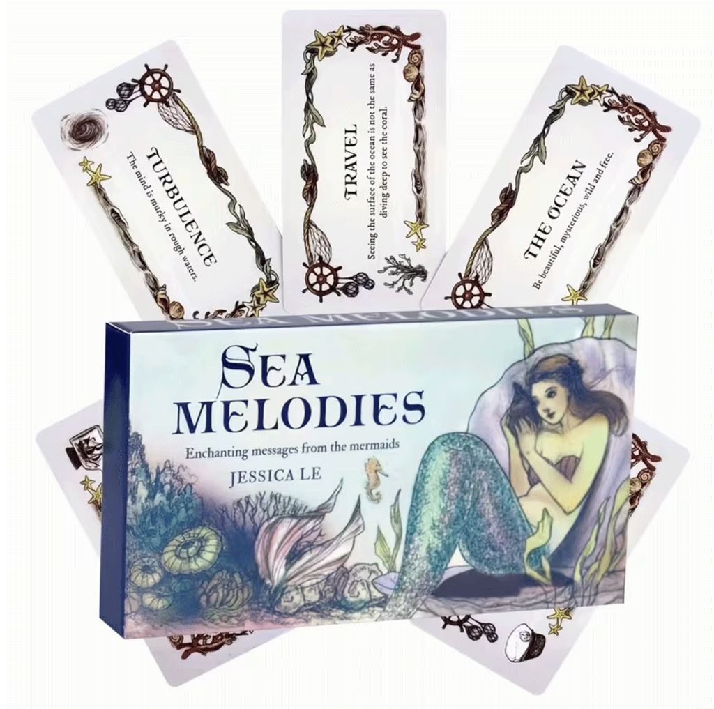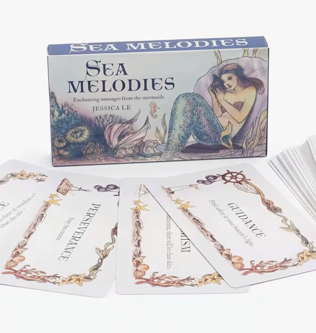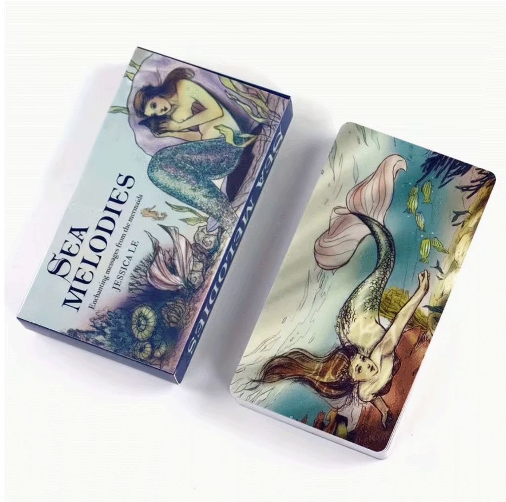 Dive into the endless ocean and discover a world of Mermaid Magic. This set of 40 inspiring cards beckons you to treasure the simple things in life and unravel the mysteries of the sea. No lengthy discourse is needed in the heart of the Mermaid. What is becomes a simple matter. When you may be feeling lost in the currents of everyday life, let the enchanting and mystical songs of the mermaids guide you towards the right path – the simple solution. Find your peace in the legends and lore of the deep blue sea. And enjoy the hand painted artwork depicted on the backs of the cards. Each one conjures gentle love for mermaids and the sea.