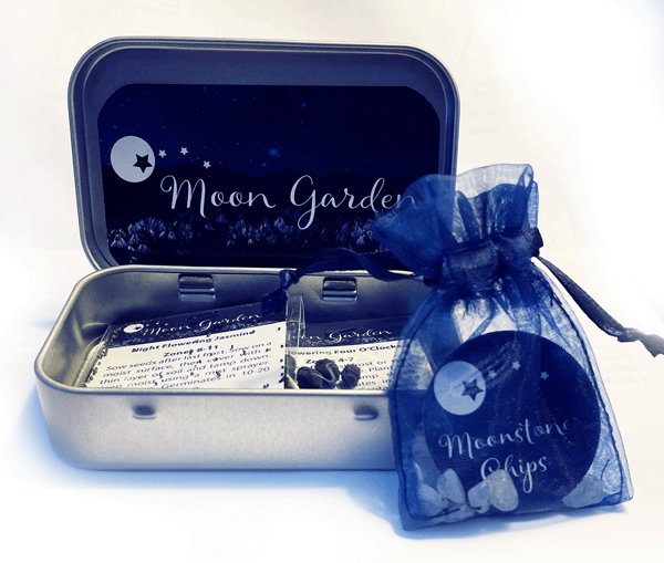This delightful little tin holds the promise of moonlight beauty and midnight fragrance to enhance your dreaming. It comes with 5 seed packets of precious night bloomers, all of which are known to offer the best perfume any garden could grow. You will receive Moonflowers, Phlox, Jasmine, Four O'Clocks, and Catchfly. These are traditional garden favorites that have been rewarding moon lovers for centuries. This kit was originally produced by a very special woman who loved her night garden so much, she spent many waking hours after dark enjoying the late night blooming time. She passed earlier this year, and I am honoring her memory by recreating her wonderful kit. She is my sister, a devoted nurse for 50 years and the most magical moon-lover I ever knew. She wrote the flower poetry on each of the seed cards. I honor her legacy by making this kit available.